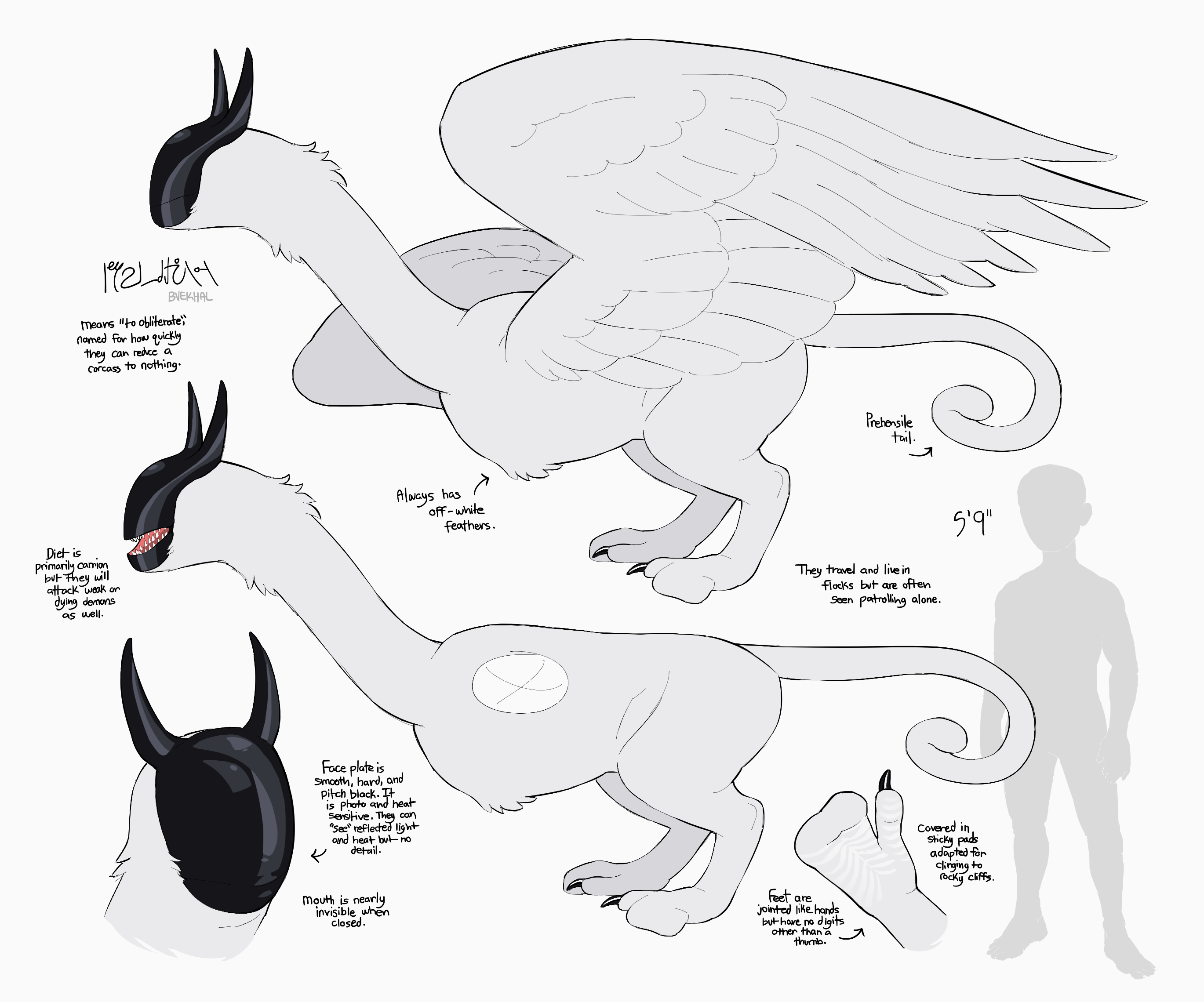 Bvekhal (to obliterate) are mid-sized, white, feathered creatures. They form large flocks, nesting together in and around caves in Chipal. Their primary food source is carrion, but they may also attack weak, dying, or vulnerable young demons as well. They are named for their ability to quickly descend on a carcass and reduce it to bones in a matter of seconds.