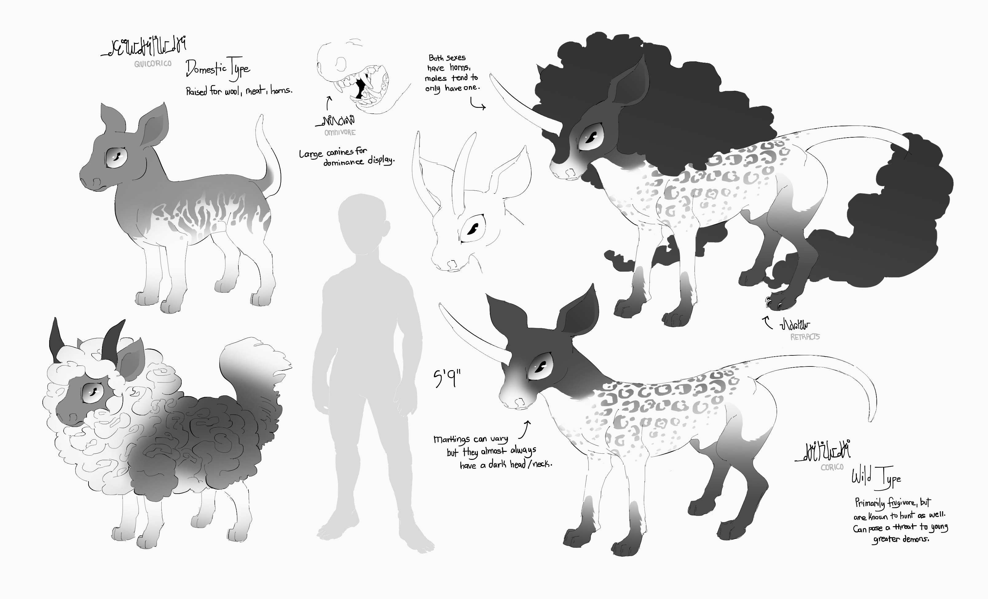 Corico (horn) are large, solitary beasts that live in forested areas. They are omnivorous frugivores and primarily eat plants, nuts, and fruits, but they will eat meat when they can and have been known to pose a threat to young greater demons. Their smaller, domesticated counterparts are the quicorico (small horn), which are typically raised by greater demons for their wool, meat, and other resources.